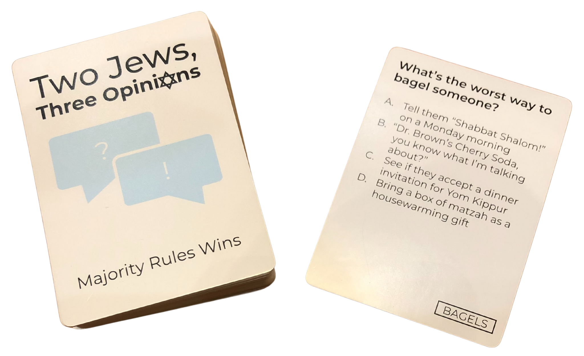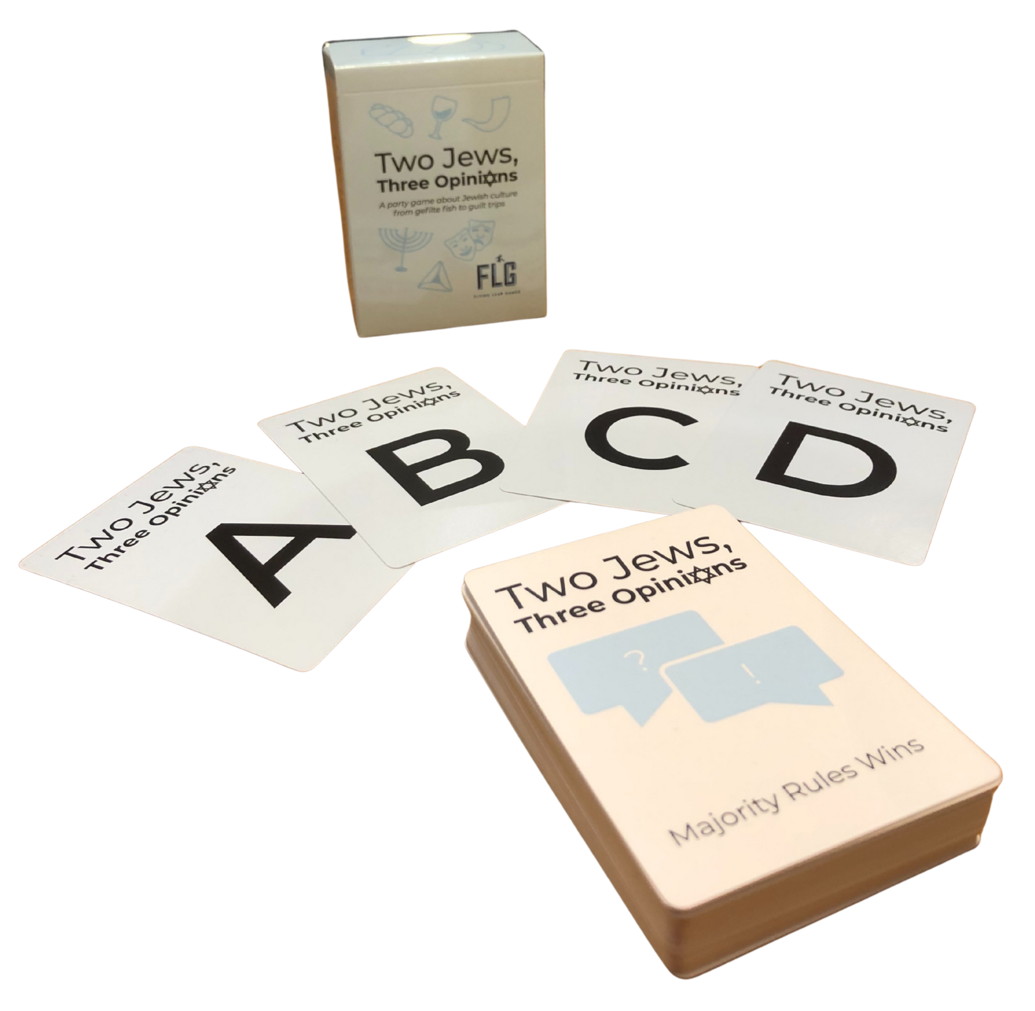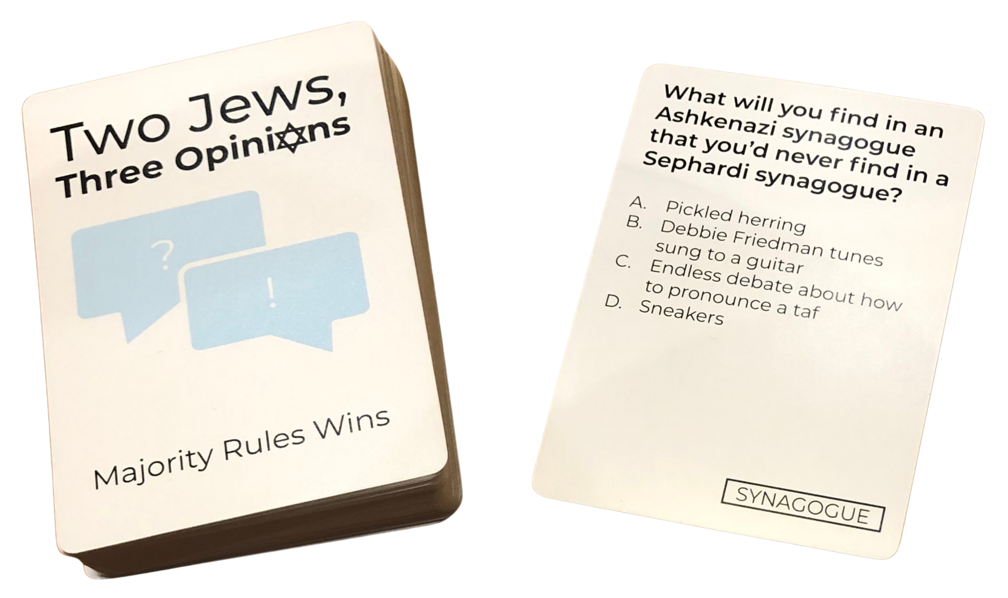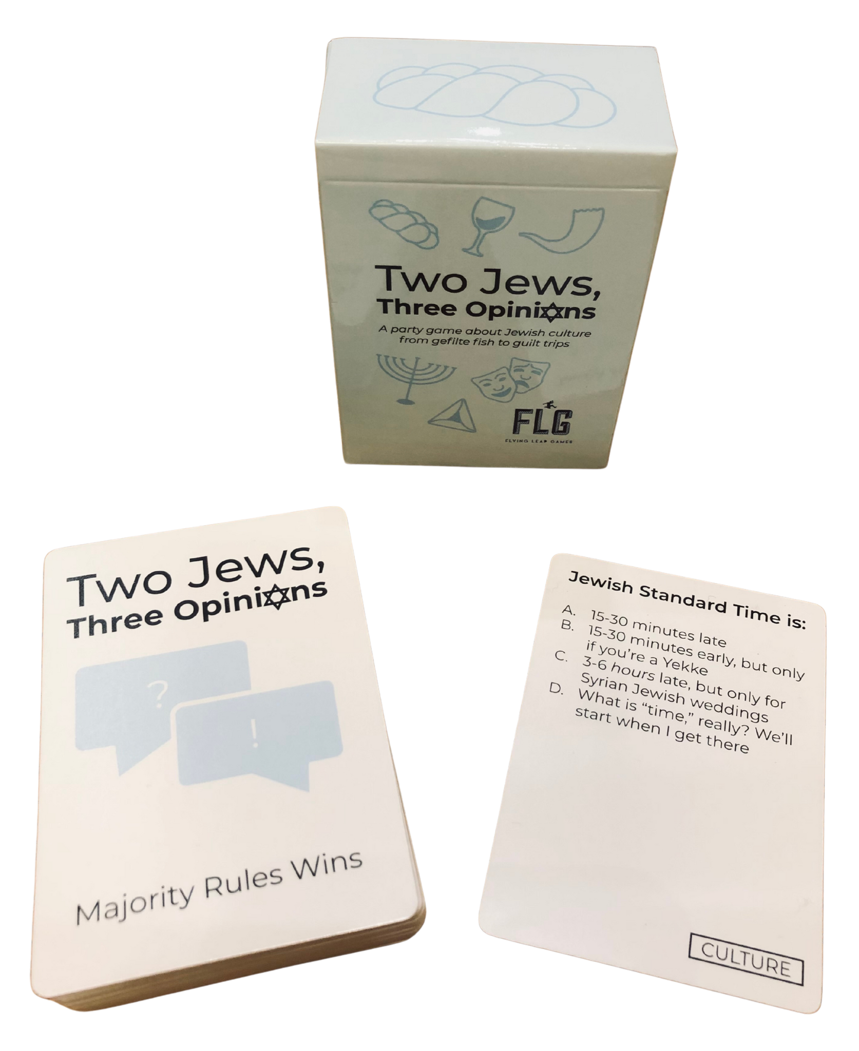 Players vote on their answers to subjective, multiple choice questions about Jewish culture and Judaism. A representative from the majority and each minority opinion then take turns defending why THEIR answer is best...in 45 seconds or less. The game brings laughs, silly debates, and funny memories to players. Two Jews, Three Opinions appeals to secular Jews, Orthodox Jews, Jews in between (and even tested well with non Jewish groups!). The game is family friendly.