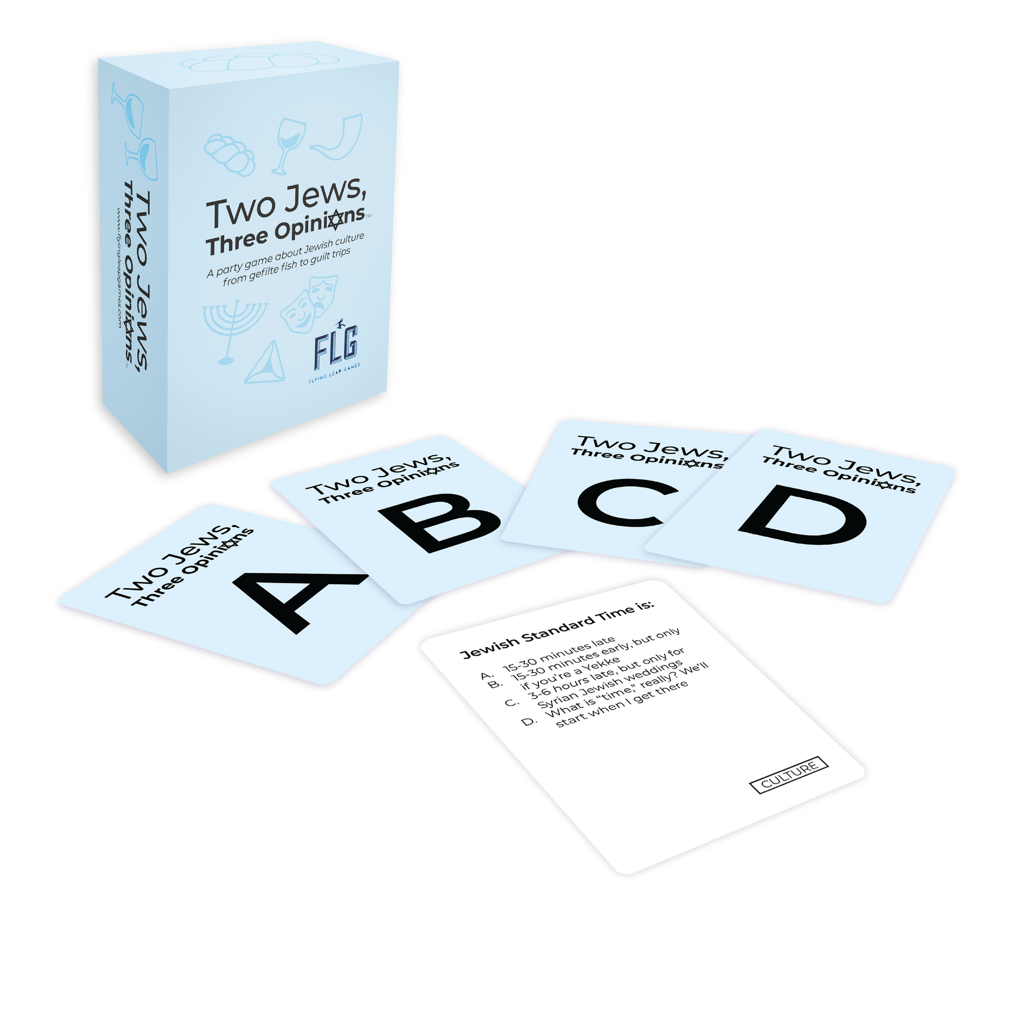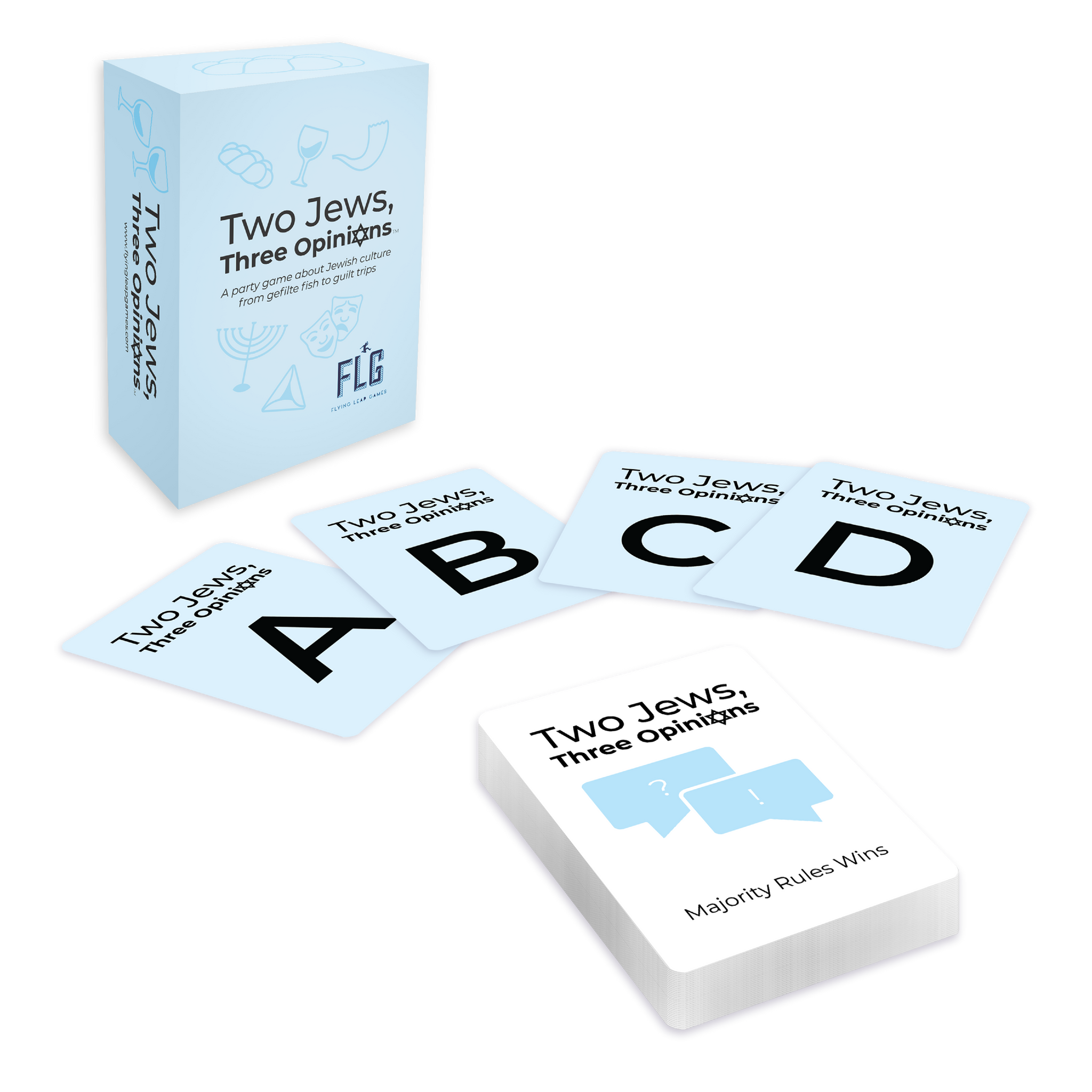 Players vote on their answers to subjective, multiple choice questions about Jewish culture and Judaism. A representative from the majority and each minority opinion then take turns defending why THEIR answer is best...in 45 seconds or less. The game brings laughs, silly debates, and funny memories to players. Two Jews, Three Opinions appeals to secular Jews, Orthodox Jews, Jews in between (and even tested well with non Jewish groups!). The game is family friendly.